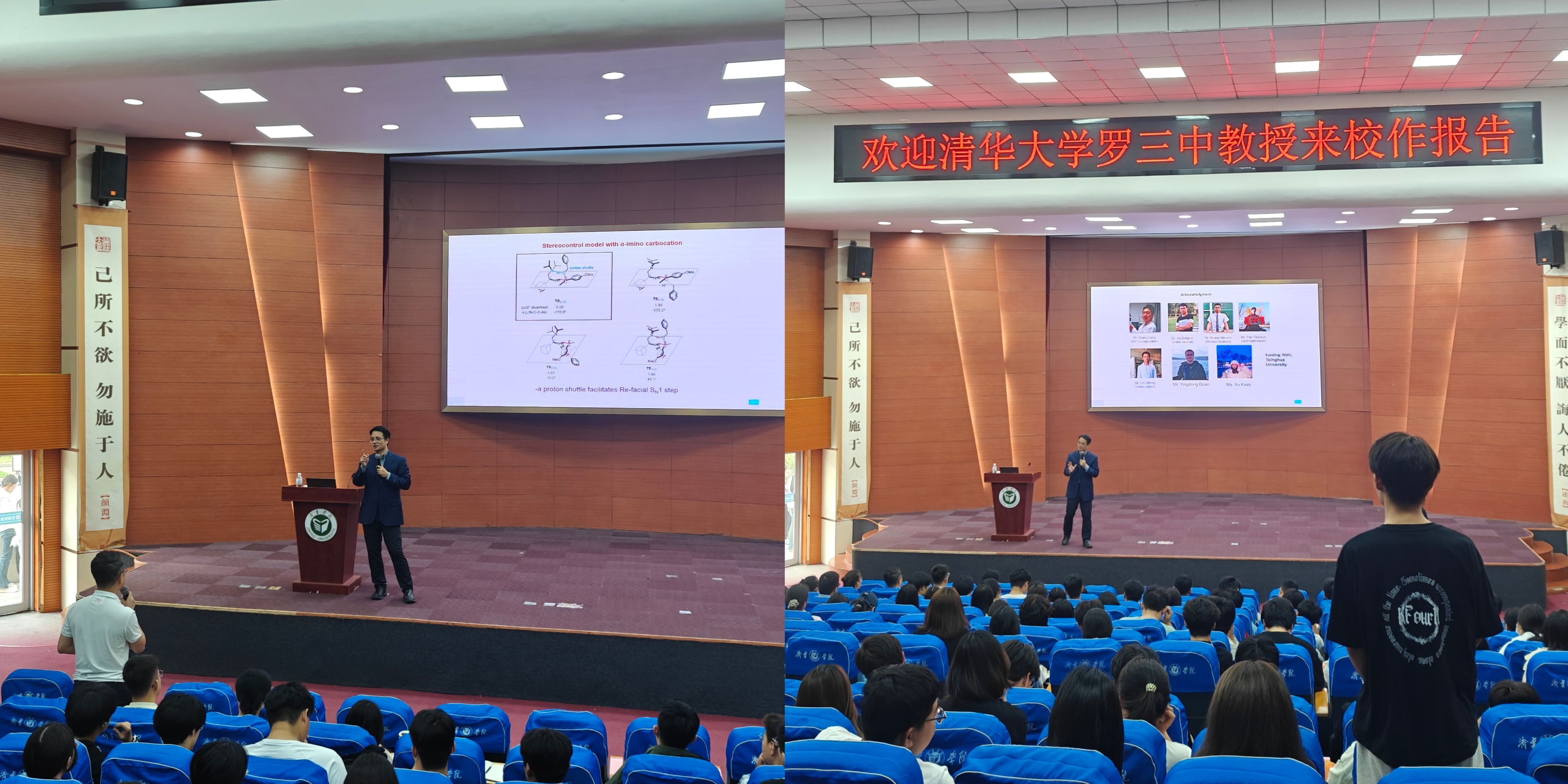 报告会由化学化工与材料学院院长刘涛主持,170余名师生参加。罗三中以“仿生小分子催化:手性中间体的外场调控”为题,聚焦仿生小分子催化领域,深入剖析了手性中间体的外场调控机制,分享其科研团队在该领域的研究成果和工作进展。