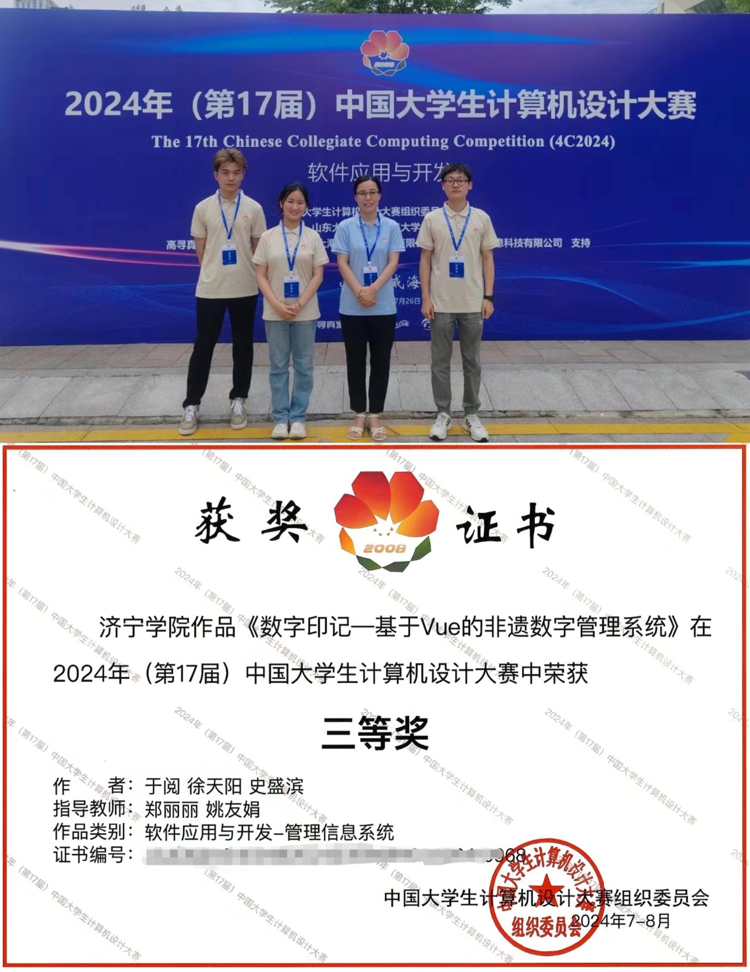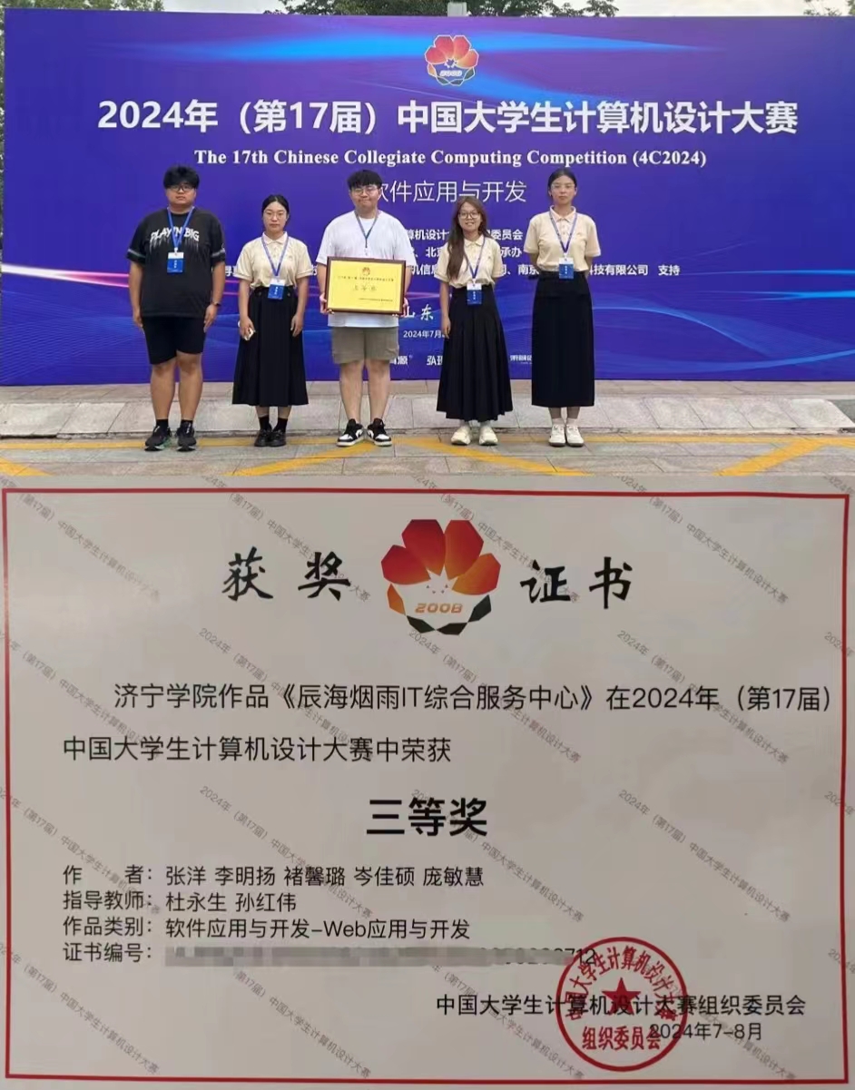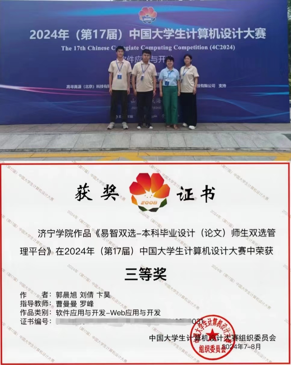 7月23-25日第17届中国大学生计算机设计大赛(济南决赛区)“软件应用与开发”赛道在山东大学(威海校区)举办,来自全国422所高校、647支代表队伍,近2700名参赛队员在为期3天的比赛日程中展开了激烈角逐。经过省赛初赛、决赛层层选拔推荐,我校计算机科学与工程学院的3支队伍参加了此赛道的比拼。7月25日下午,大赛召开闭幕式并宣读了获奖名单,郭晨旭团队的“易智双选-本科毕业设计(论文)师生双选管理平台”、 于阅团队的“数字印记—基于Vue的非遗数字管理系统”和张洋团队的“辰海烟雨IT综合服务中心”3个作品均获得全国三等奖。