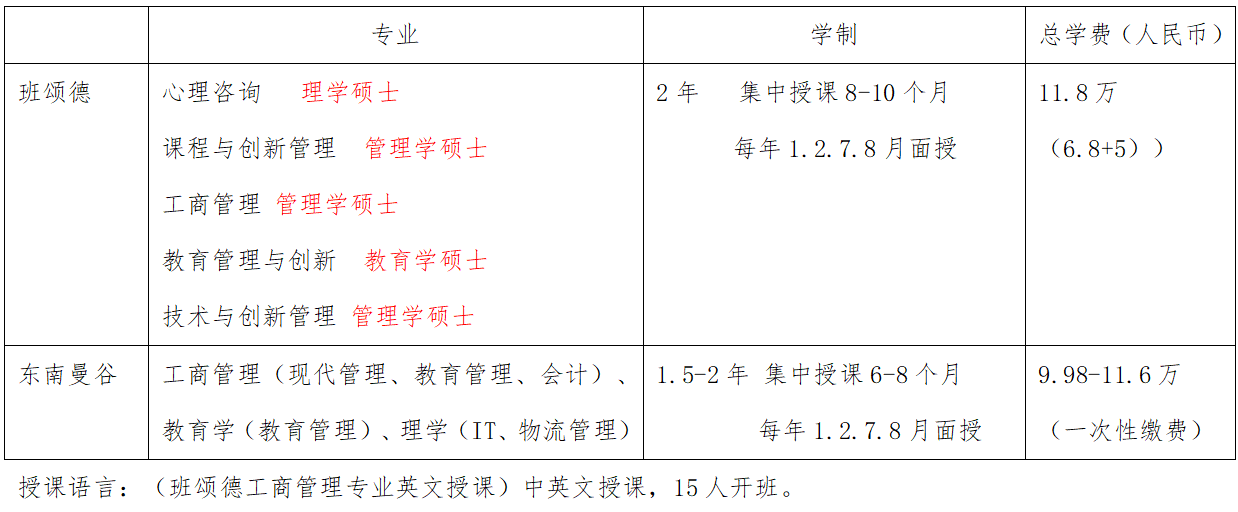 三、泰国大学硕士专业、学制、学费