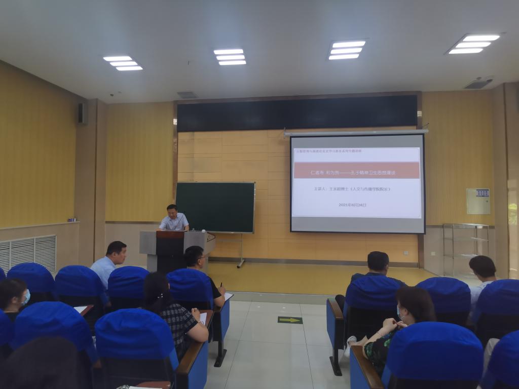 6月24日下午,应后勤管理与基建处邀请,人文与传播学院院长王永超博士在文科楼B101做了以《仁者寿和为贵——孔子精神卫生思想漫谈》为主题的党史学习教育专题讲座。后勤管理与基建处全体党员及员工、劳务派遣制人员以及各餐饮公司、物业公司负责人聆听了讲座。讲座由后勤管理与基建处处长、党支部书记张永刚主持。