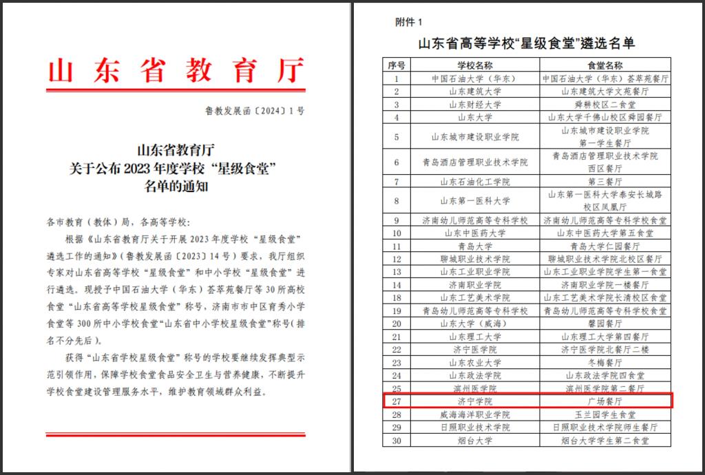 近日,山东省教育厅下发《关于公布2023年度学校“星级食堂”名单的通知》,我校广场餐厅荣评山东省高等学校“星级食堂”称号,全省共有30所高校食堂获此殊荣。