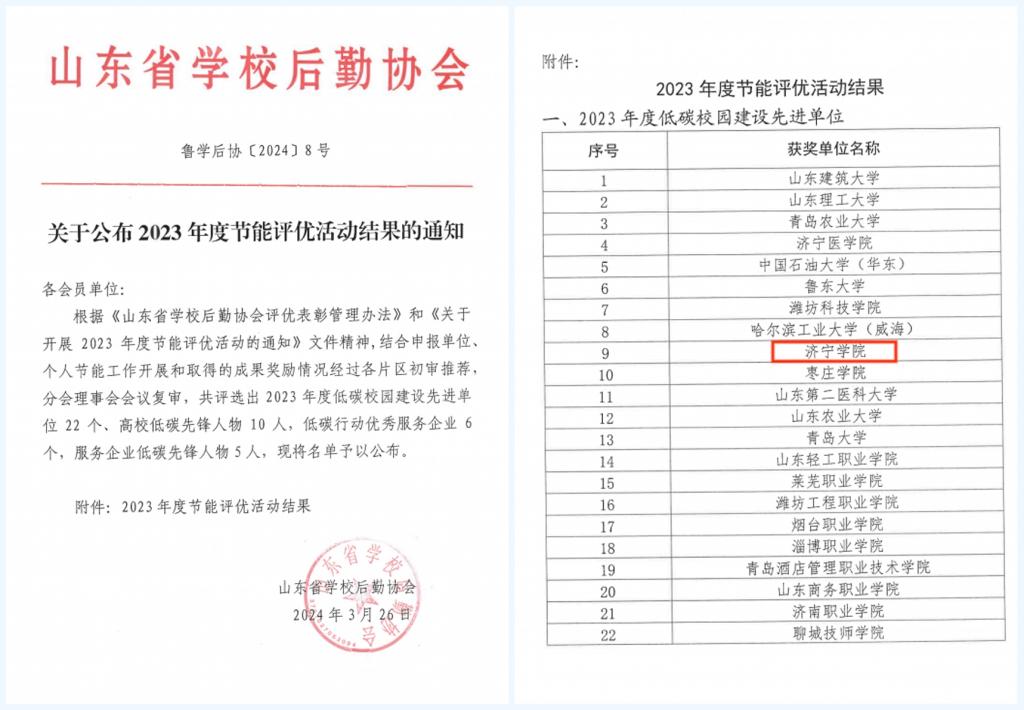 近日,山东省学校后勤协会2023年度节能评优活动评选结果揭晓,我校荣获“2023年度低碳校园建设先进单位”称号。