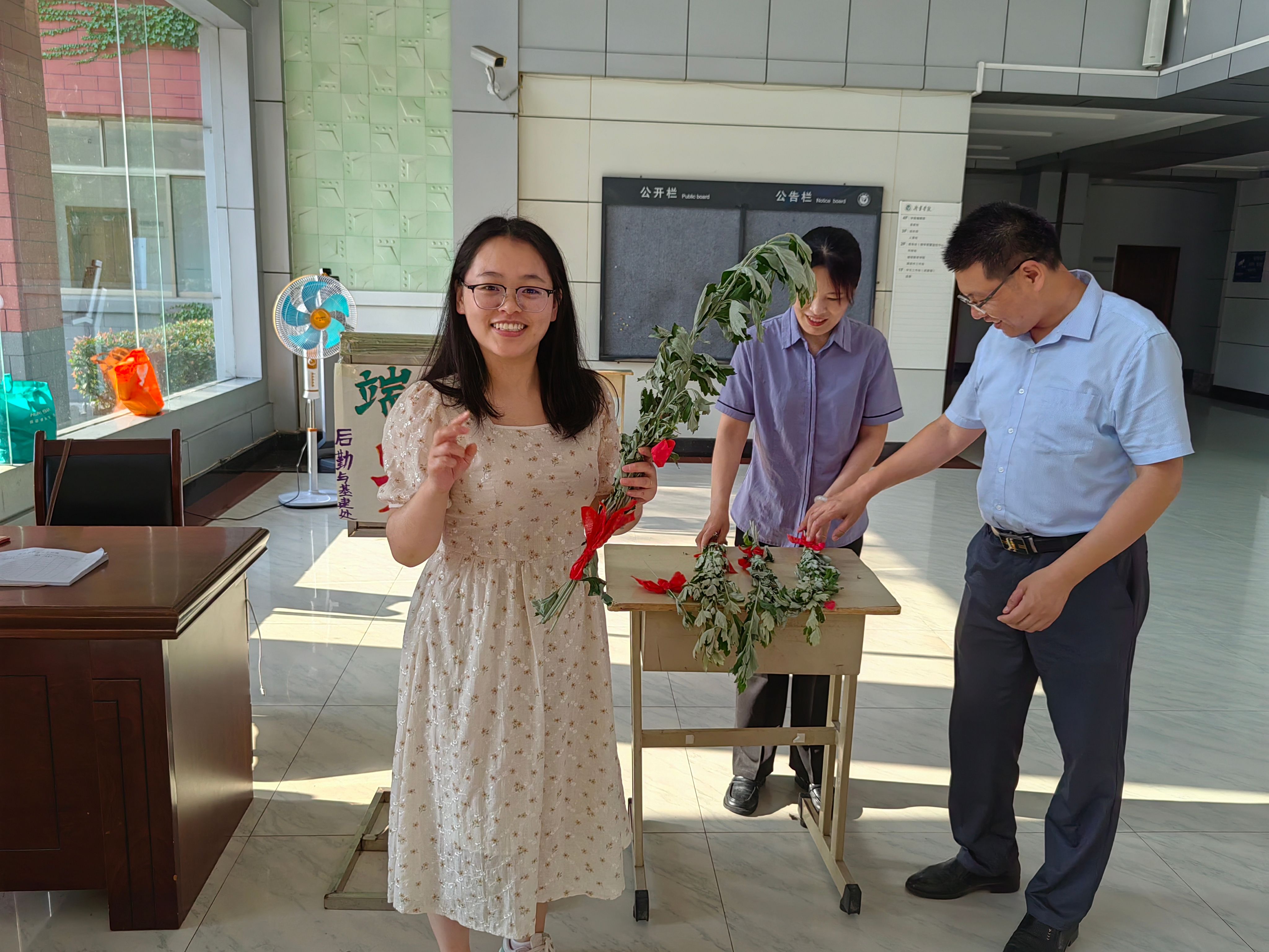 艾草手中拿,祝福送安康。6月7日下午,在端午节来临之际,后勤管理与基建处与宏泰、祥泰物业工作人员共同举办了“浓情端午,送‘艾’回家”活动,他们制作了精美的艾叶花束,美好的寓意伴着一声声“端午安康”的真挚祝福,送到师生们的手中,气氛非常温馨。