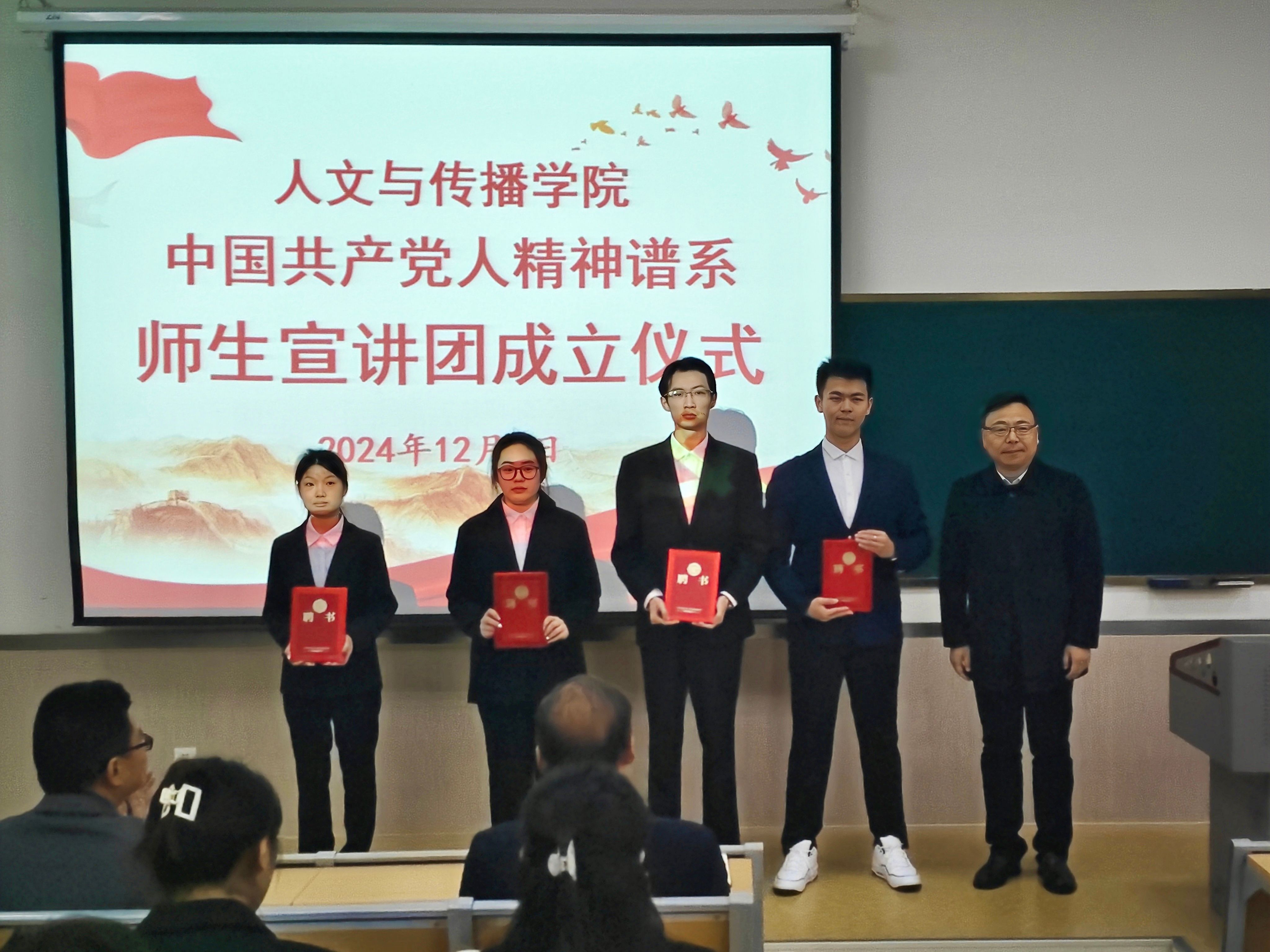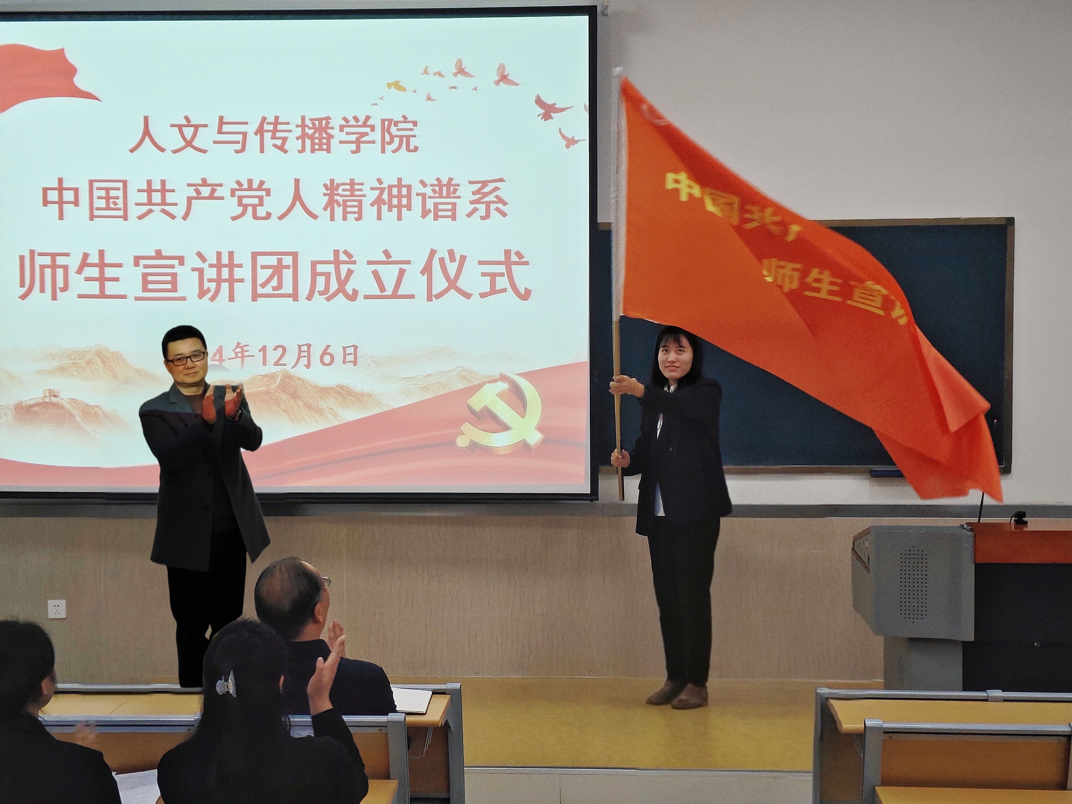 成立仪式上,刘国栋为宣讲团授旗,朱桂林、王永超为宣讲团成员代表颁发聘书,张颖慧宣读《人文与传播学院关于成立“中国共产党人精神谱系师生宣讲团”的决定》,张甜宣读《人文与传播学院首届“中国共产党人精神谱系师生宣讲团”成员名单》。