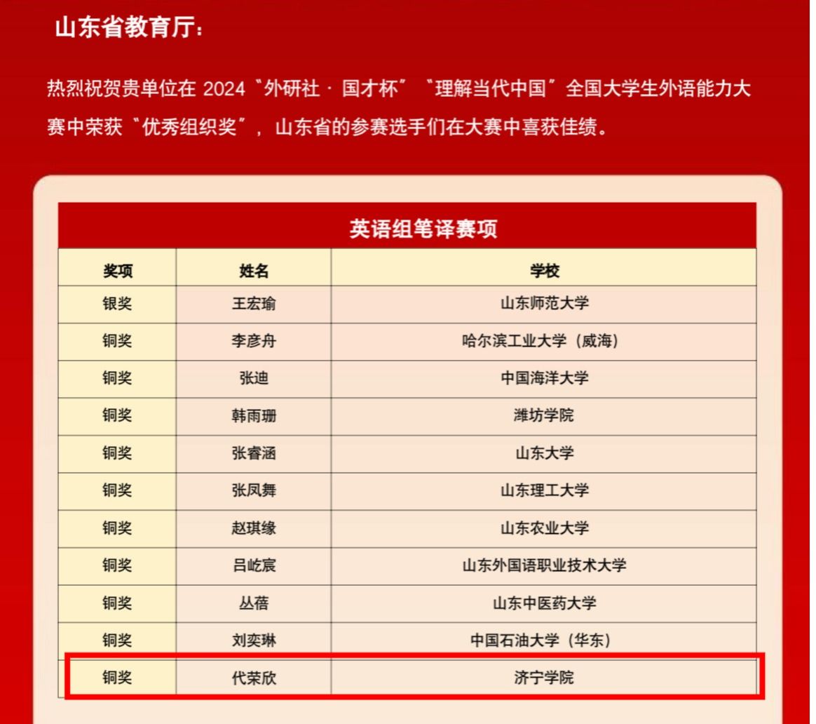 代荣欣在“外研社·国才杯”“理解当代中国”山东省赛中,以金奖第8名的成绩脱颖而出,成功晋级国赛。在国赛中,她与来自全国各地的197名本科生和硕士生同台竞技,并凭借扎实的英汉双语基础和出色的应变能力,最终斩获铜奖,刷新了我校学生自参加“外研社·国才杯”以来的最好成绩。