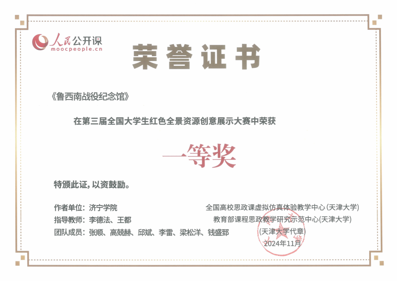 近日,第三届全国大学生红色全景资源创意展示大赛结果在人民公开课平台揭晓,我校计算机科学与工程学院参赛作品《鲁西南战役纪念馆》获得全国一等奖。
