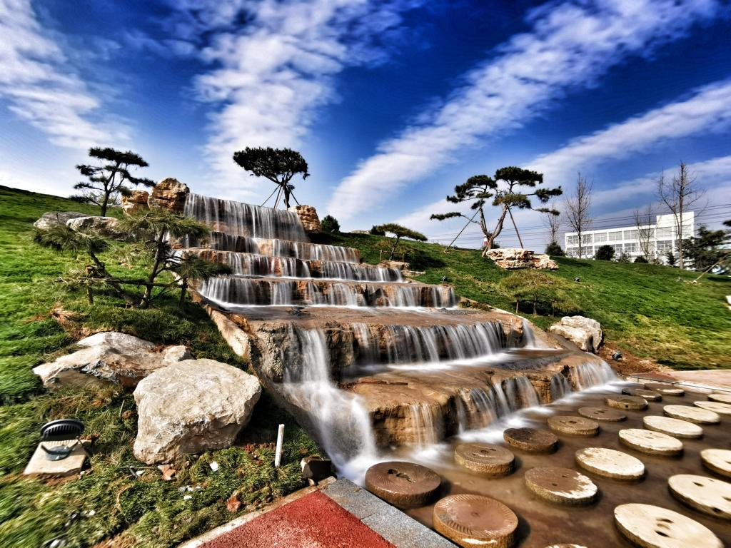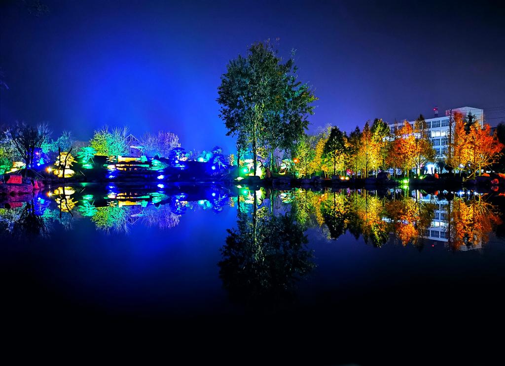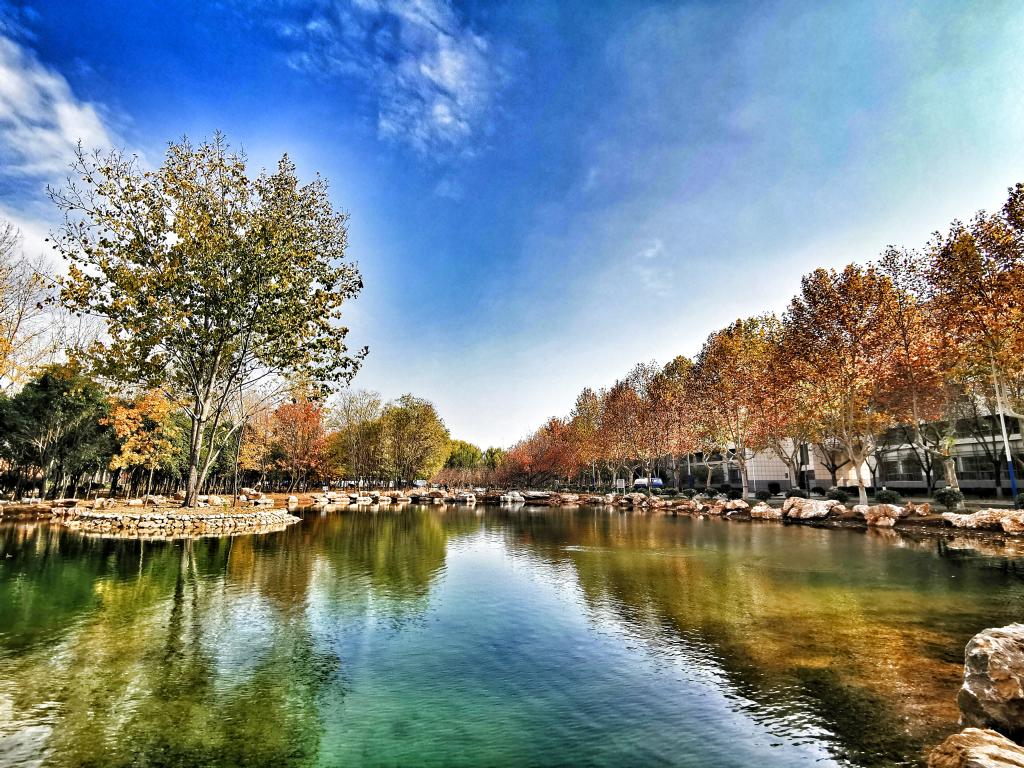 湖面整体呈圆形,但不比圆形那么板板正正,湖的四周是由石子堆砌而成的,有些进入湖面多一些,有的则比较“害羞”比较靠外面。层层叠叠的石子将湖围得严严实实,密密麻麻的树把石子堵得老老实实,老让人觉得这树像是长在湖里。湖水清澈,仿佛苏轼诗句中的赤壁——清风徐来,水波不兴,此时在湖的四周放些座椅,让上课劳累的莘莘学子有一席休憩之地,感受来自湖水的温柔,感受来自小济的体贴,好似飘飘乎如遗世独立,羽化而登仙。