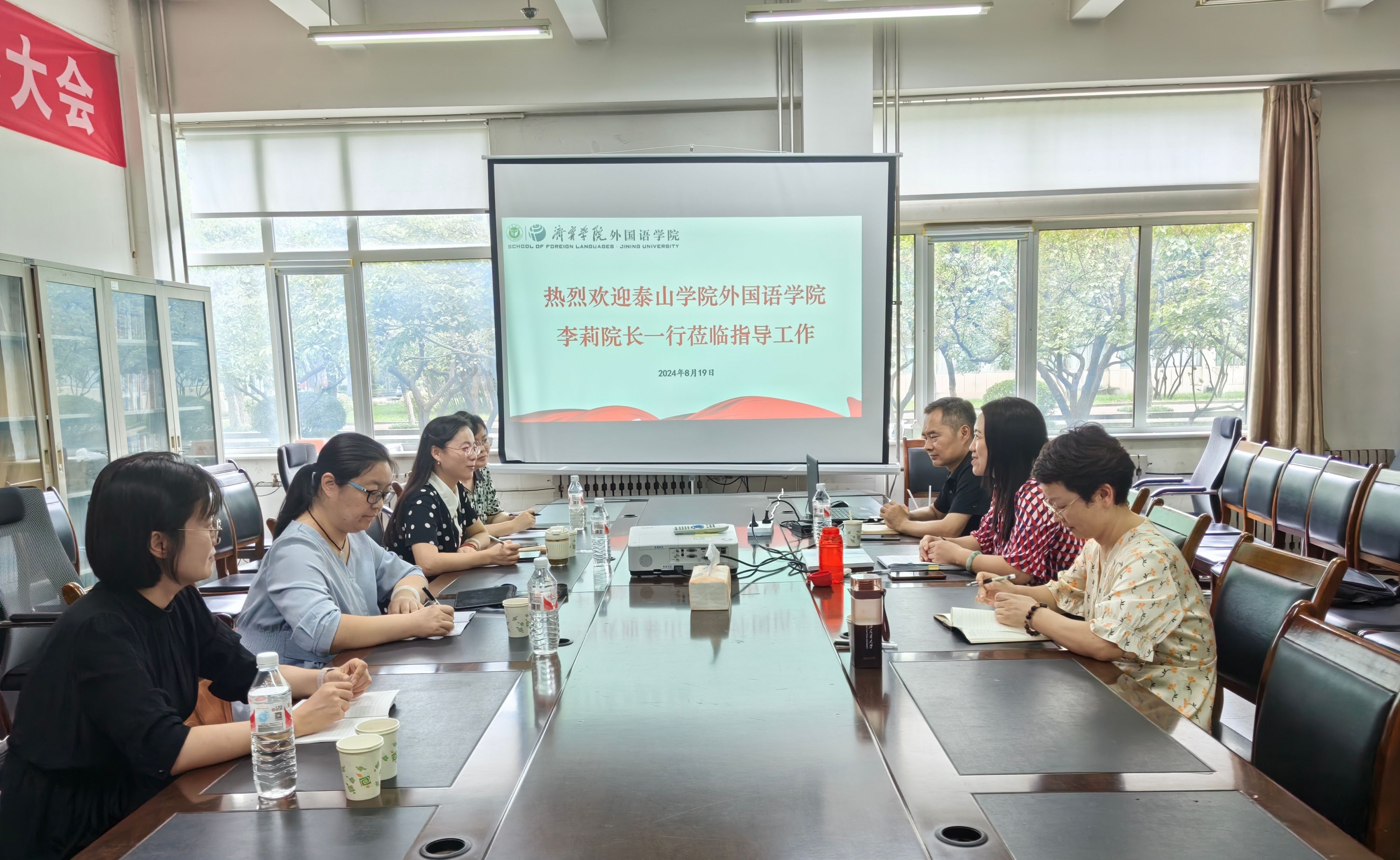 8月19日,泰山学院外国语学院副院长李莉以及专业负责人、骨干教师一行4人就师范专业认证工作来外国语学院进行交流。我校外国语学院副院长张颖、学术副院长闫彩霞、英语专业负责人吴瑞民等参加座谈。