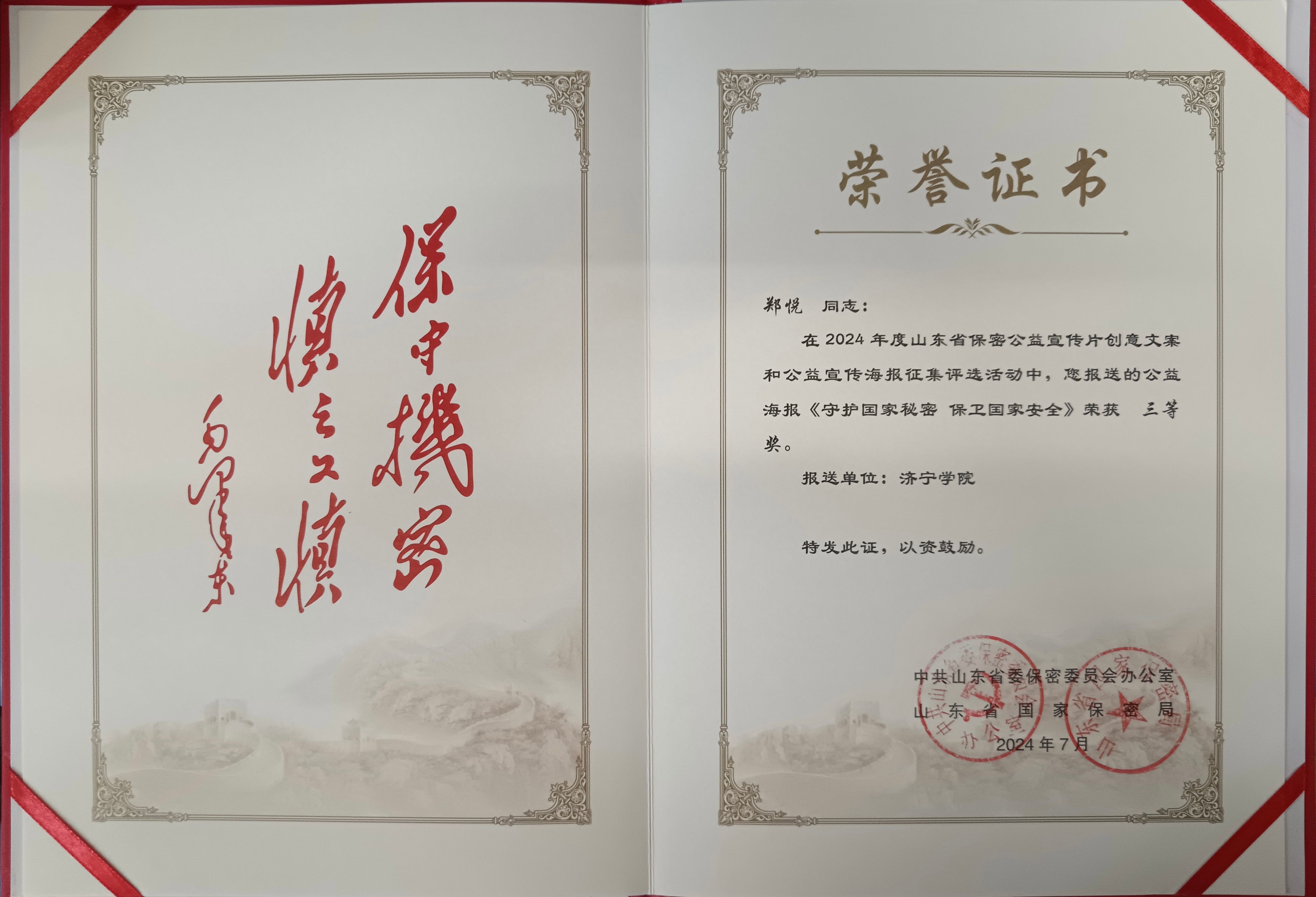 近日,由中共山东省委保密委员会办公室、山东省国家保密局主办的2024年度保密公益宣传片创意文案和保密公益宣传海报征集活动落下帷幕,马克思主义学院2023级思想政治教育专业学生郑悦荣获三等奖。
