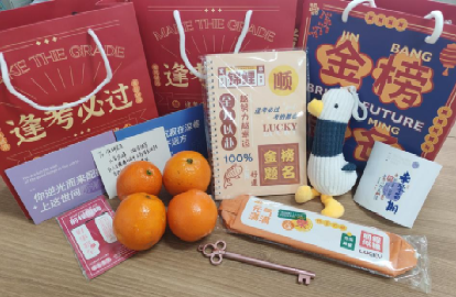 最后,老师们为考研学子送上“逢考必过”“金榜题名”大礼包,希望学生带着写满老师祝福的贺卡、装上“研”路领航笔袋、背上“加油鸭”、用“梦想成真”书签、贴一“研”为定贴纸、写满“未来可期”笔记本,吃一战“橙”研橙子、揣“苹”稳上岸苹果,拿上通往成功之门的钥匙,“研”阵以待,全力以赴,祝福同学们逢考必过、“研”路辉煌。