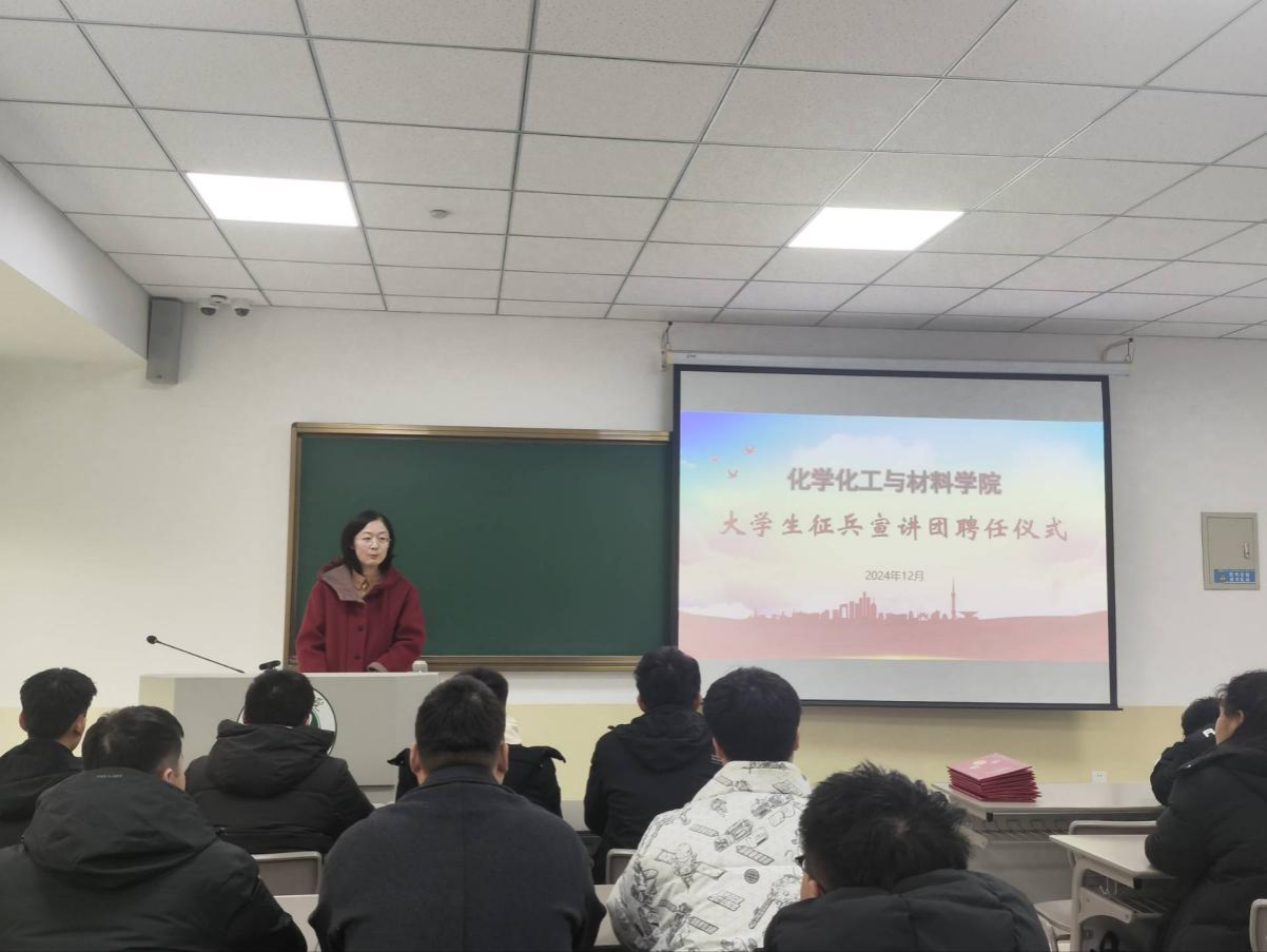 12月12日,化学化工与材料学院开展“立志参军,精忠报国”2025年大学生征兵宣讲会。学院党委书记马新蕾出席活动,辅导员高峰及学院征兵宣讲团进行主题宣讲,各年级有意参军的同学们积极参与本次宣讲会。会议由学院辅导员丰雪情主持。