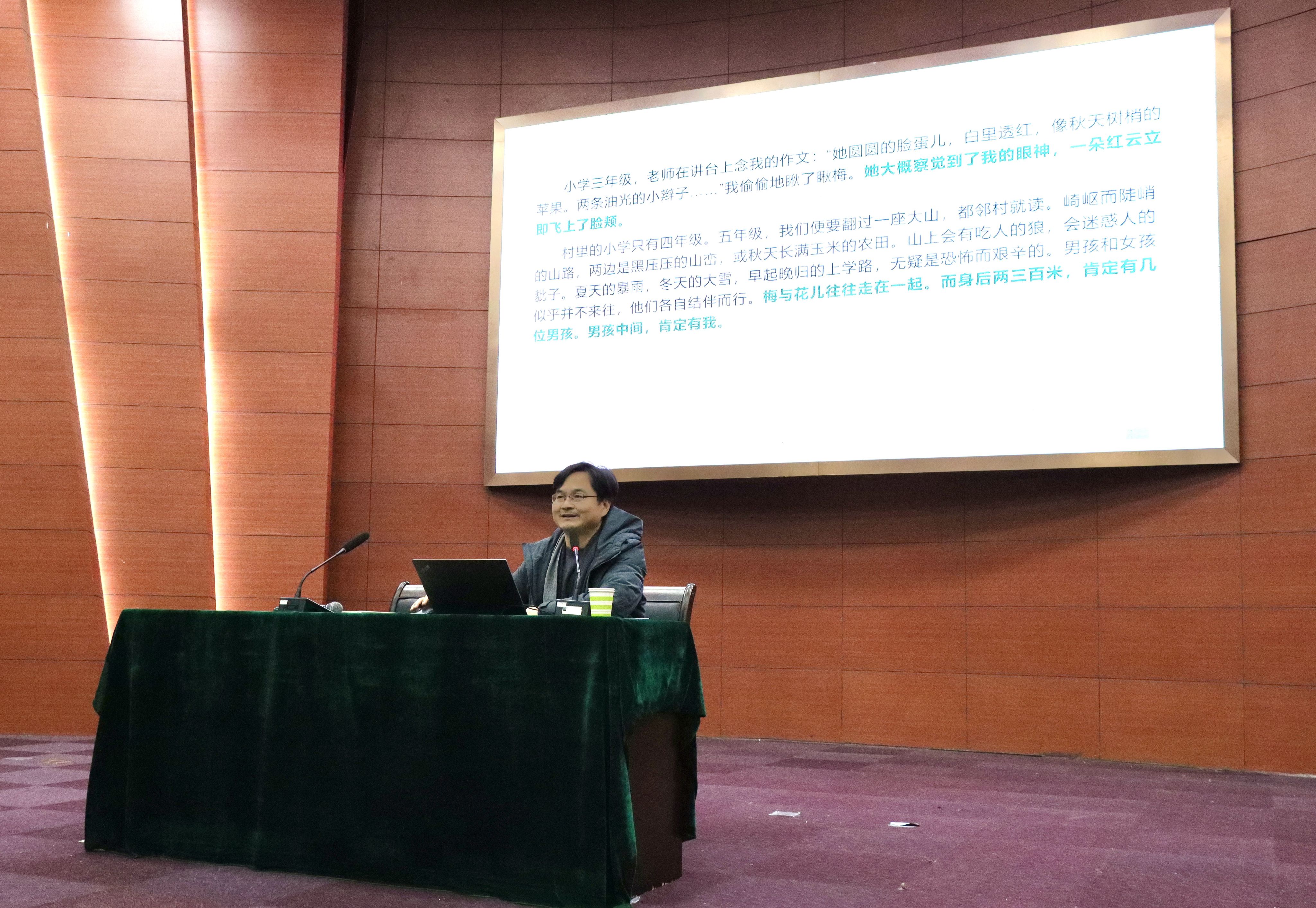 刘元堂以其散文《梅》为切入点,结合古代画论及自身的艺术实践,分享了他在书法、国画和散文创作上的心路历程,讲述了在写生过程中的奇闻趣事,其幽默风趣的语言赢得了阵阵掌声。最后鼓励同学们要秉承十年磨一剑的精神,潜心学习,精进技艺,不断攀登艺术高峰。