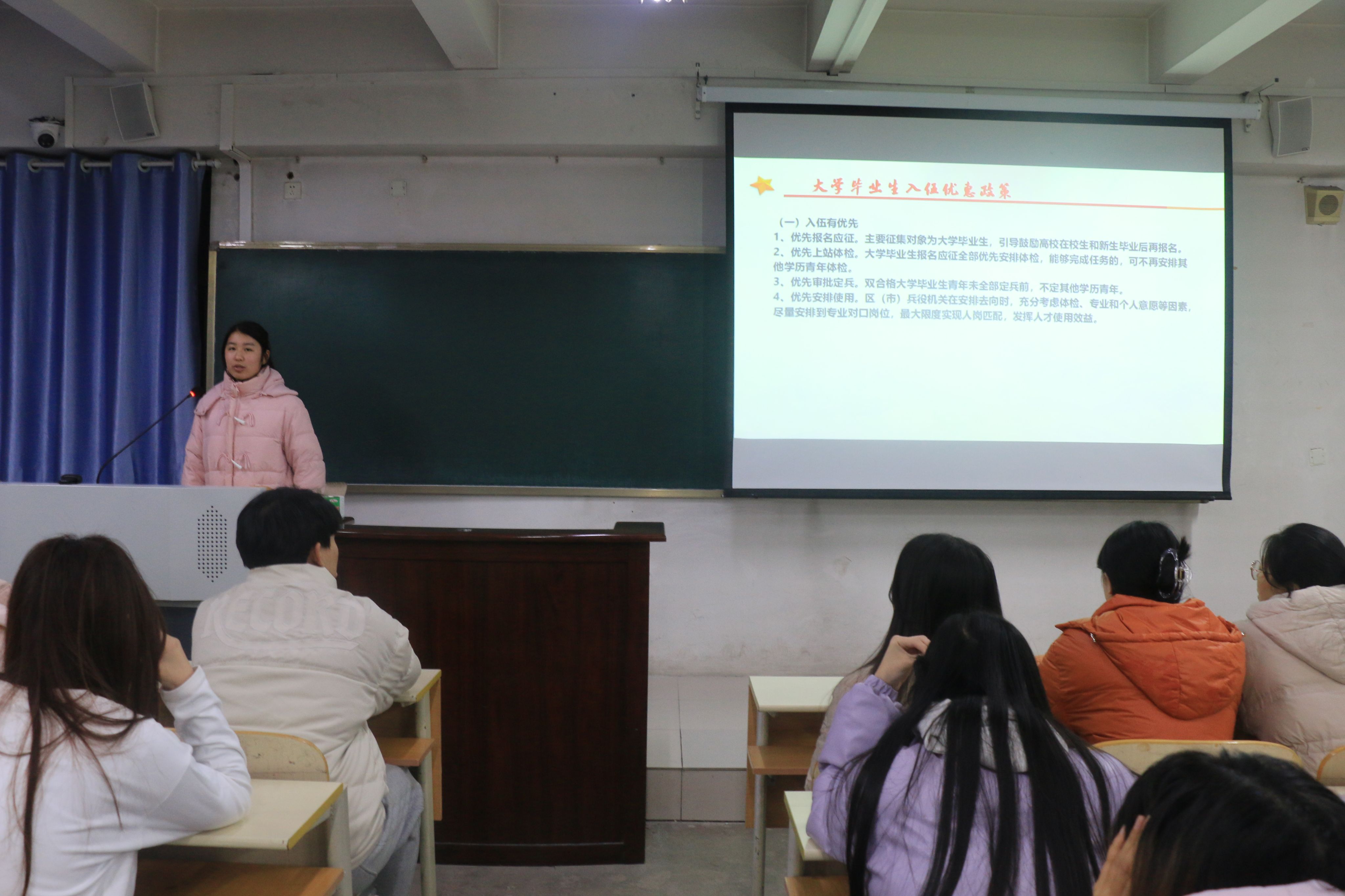 观影结束后,学院邀请两位退役的大学生——石钰麟和朱梓萌为同学们作征兵宣讲。她们用亲身经历和生动事例,向同学们详细介绍了军队的生活、训练以及入伍后的种种收获和成长,为同学们普及入伍政策,并号召大家积极参军入伍。