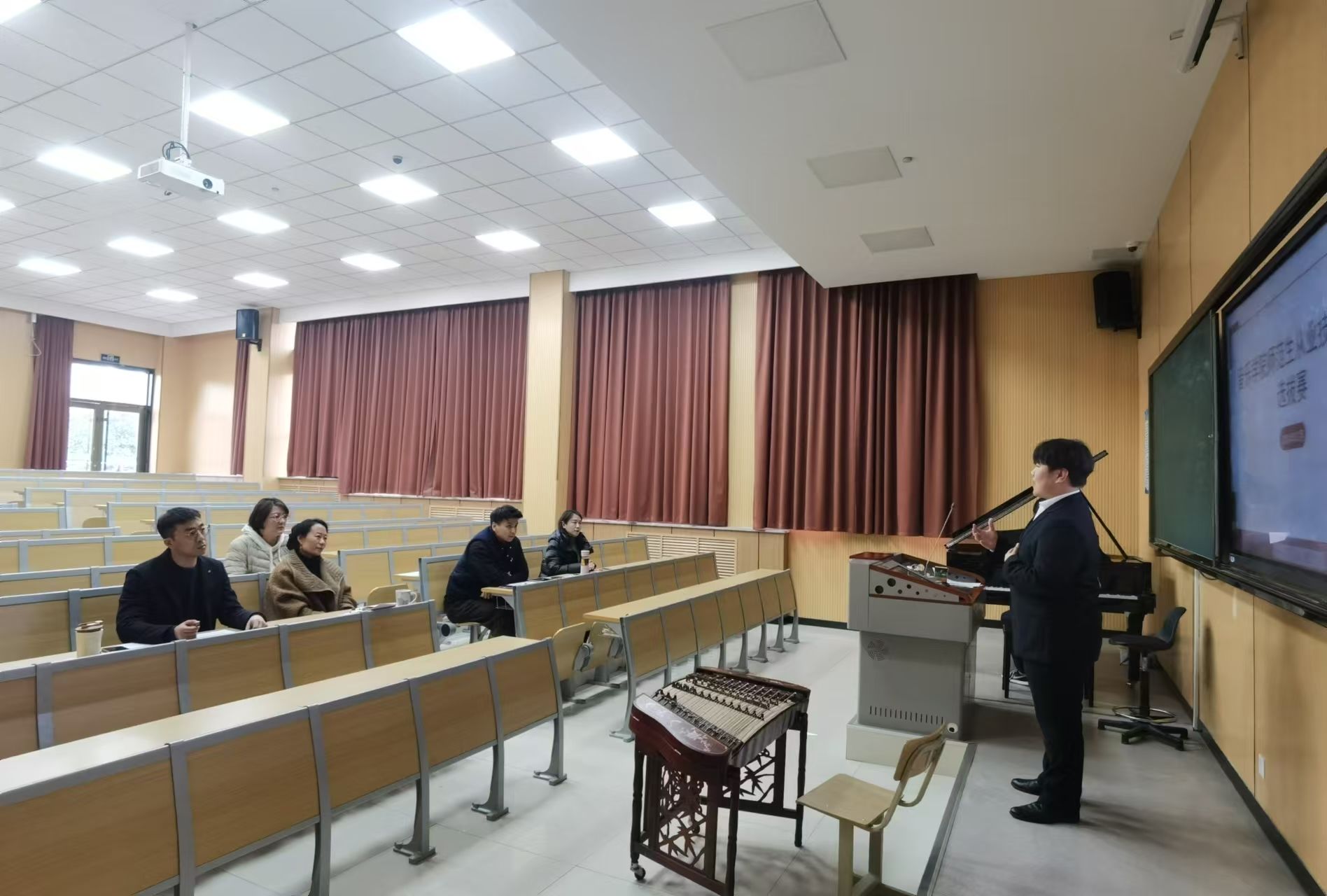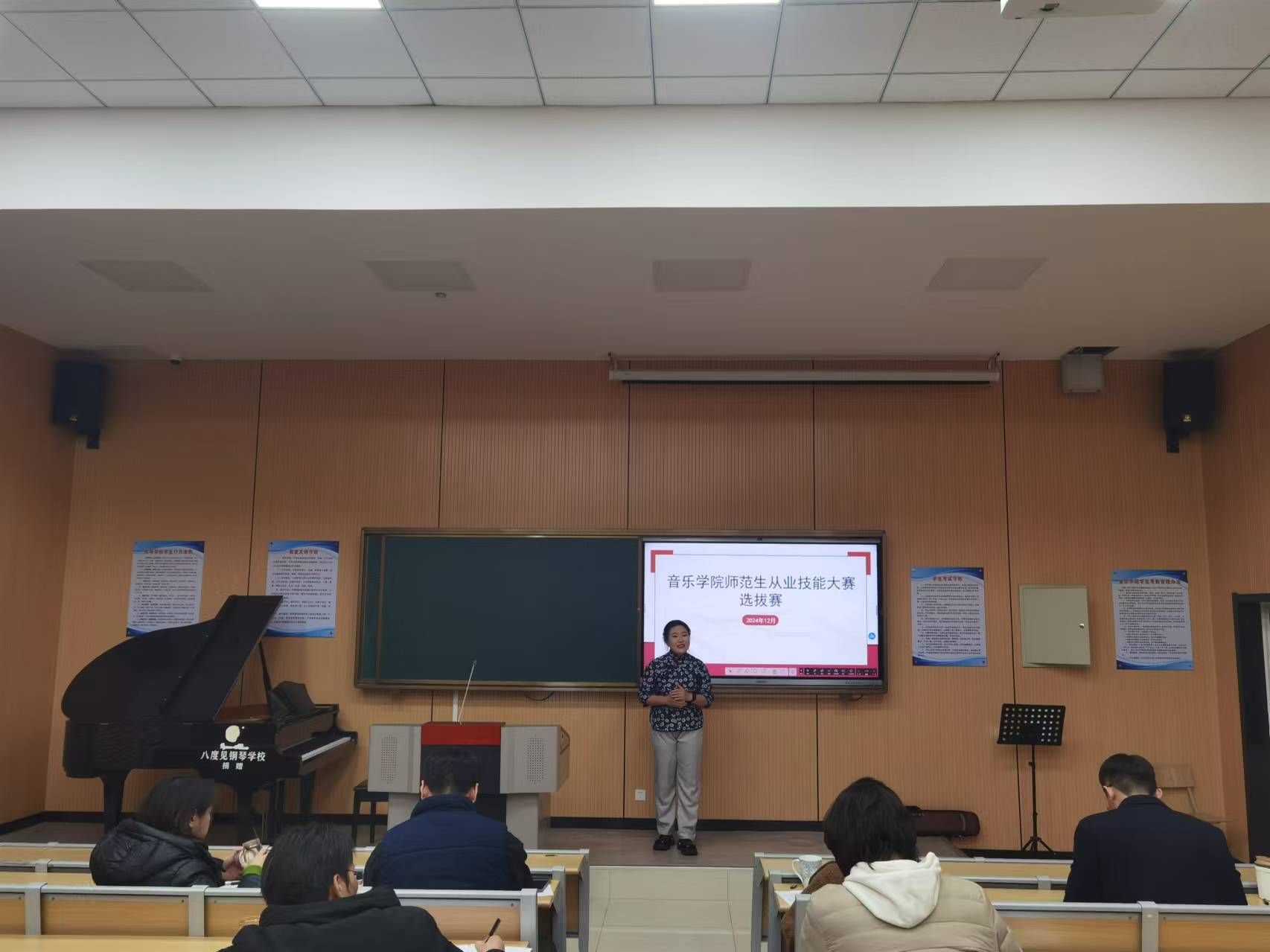 为更好备战第十三届山东省师范类高校学生从业技能大赛,近日,音乐学院在B129教室成功举办了校内选拔赛,旨在选拔出一批优秀的音乐师范生。本次选拔赛按照省赛要求设置比赛环节,参赛选手们需要完成试讲、钢琴演奏、声乐演唱以及器乐或舞蹈表演等,进一步锤炼参赛者的教学技能和个人综合素质,为即将到来的省级比赛做好充分准备。