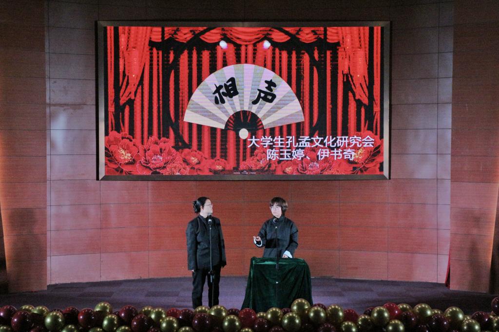 ATOPOS舞团的舞蹈表演《I can' t stop me》拉开了本次联欢会的序幕,瞬间将观众带入了喜迎新年的热闹氛围。歌曲《NEW BOY》旋律欢快明朗,充满朝气。朗诵《少年中国说》慷慨激昂,感情真挚,传递着中国少年的昂扬斗志和不屈不挠的精神。歌曲《喜欢你》《孤独颂歌》《十年》《爱丫爱丫》《红蔷薇白玫瑰》接连登场,或甜蜜浪漫或温暖慰藉或活力四射,唱出了同学们的青春风采与无限活力。相声《别出心裁》幽默诙谐、口齿伶俐,搞怪逗笑欢乐不停,赢得台下观众阵阵掌声。快板《升国旗》以明快的节奏和诙谐的语言,向同学们展示国旗的庄严与神圣,激励同学们为祖国的繁荣昌盛而不懈奋斗。《展礼仪 明师德》拜师礼展演,再现了中华传统拜师仪式,给予师生强烈的心灵震撼与洗礼。演讲《以青春之我,筑国防之梦》以独特的视角和富有感染力的语言,激励着同学们勇于担当时代重任。舞蹈《绝世舞姬》有力的舞姿与节奏感十足的音乐洋溢出青春与活力。志愿支教服务队成员献上手势舞《国家》,展现了“青春不以山海为远,志愿只向家国未来”的责任担当。合唱《歌曲串烧》渲染了现场温馨愉悦的氛围,为晚会画上了一个圆满的句号。
