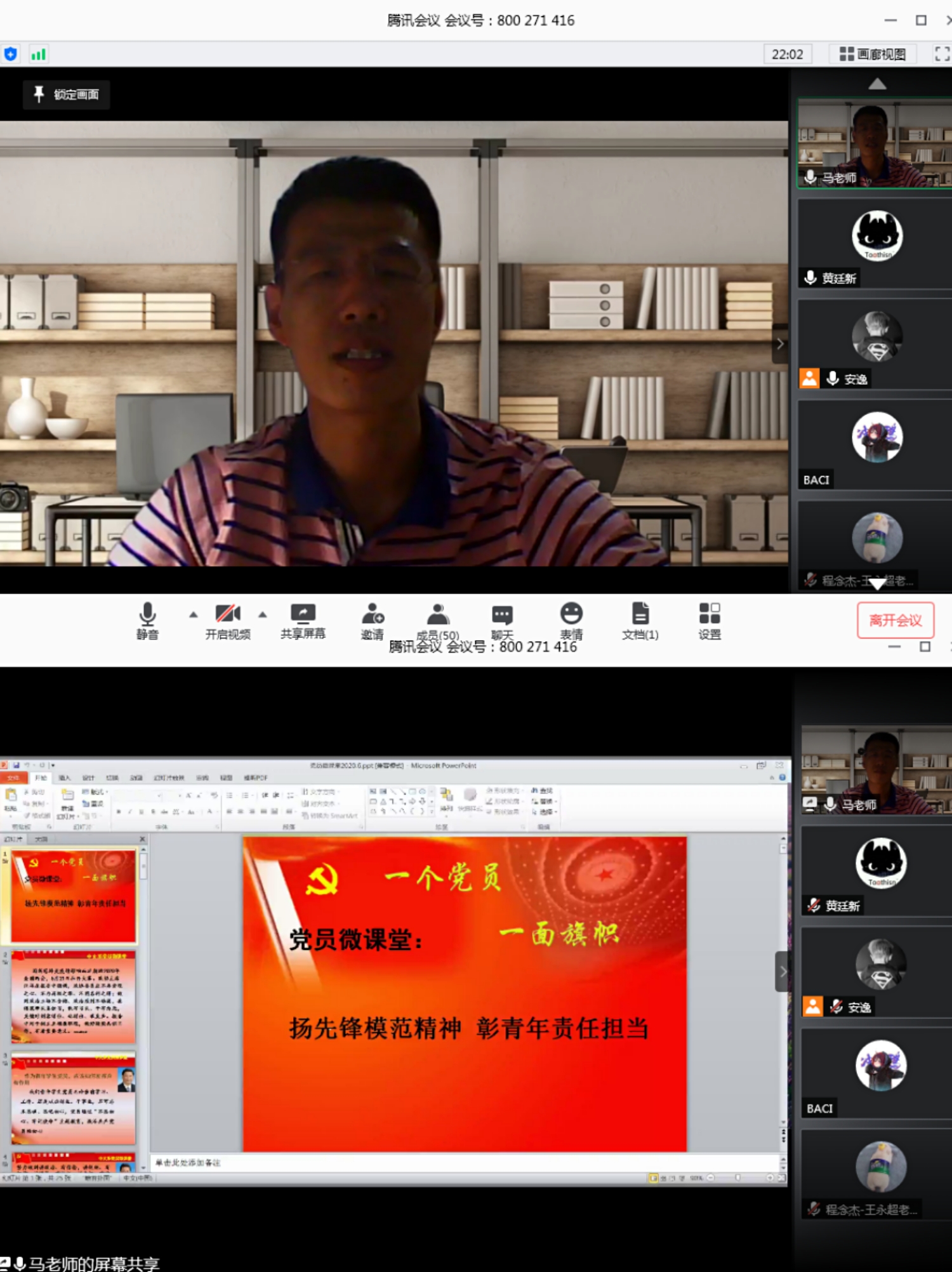 学生党支部书记马永涛以《扬先锋模范精神 彰青年责任担当》在学生党支部讲党课。他号召同学们将最新的理论政策与自己的学习生活和工作紧密联系在一起,时刻发挥先锋模范带头作用,勇于担当,传播正能量,为国家抗“疫”大局和发展大局贡献青年人的不竭力量。
